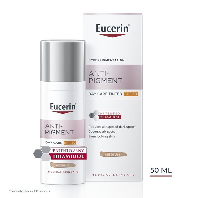 Eucerin Anti-Pigment Denní krém SPF 30 tónovaný středně tmavý obsahuje thiamidol, účinnou a patentovanou složku, která působí na základní příčinu hyperpigmentace snížením tvorby melaninu. Klinické a dermatologické testy prokázaly, že redukuje tmavé skvrny a brání jejich opakovanému výskytu. První výsledky jsou viditelné po dvou týdnech a při pravidelném používání se dále zlepšují.