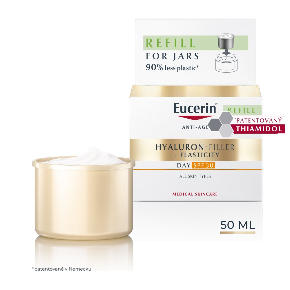 Tato HYALURON-FILLER + ELASTICITY SPF 30 Náhradní náplň obsahuje o 90 % méně plastu ve srovnání se standardní Eucerin dózou péče o pleť. Používáním této náhradní náplně můžete pomoci snížit množství plastového odpadu a přispět k udržitelnějšímu cyklu výrobků. Kompatibilní se všemi dózami Eucerin Péče o pleť.