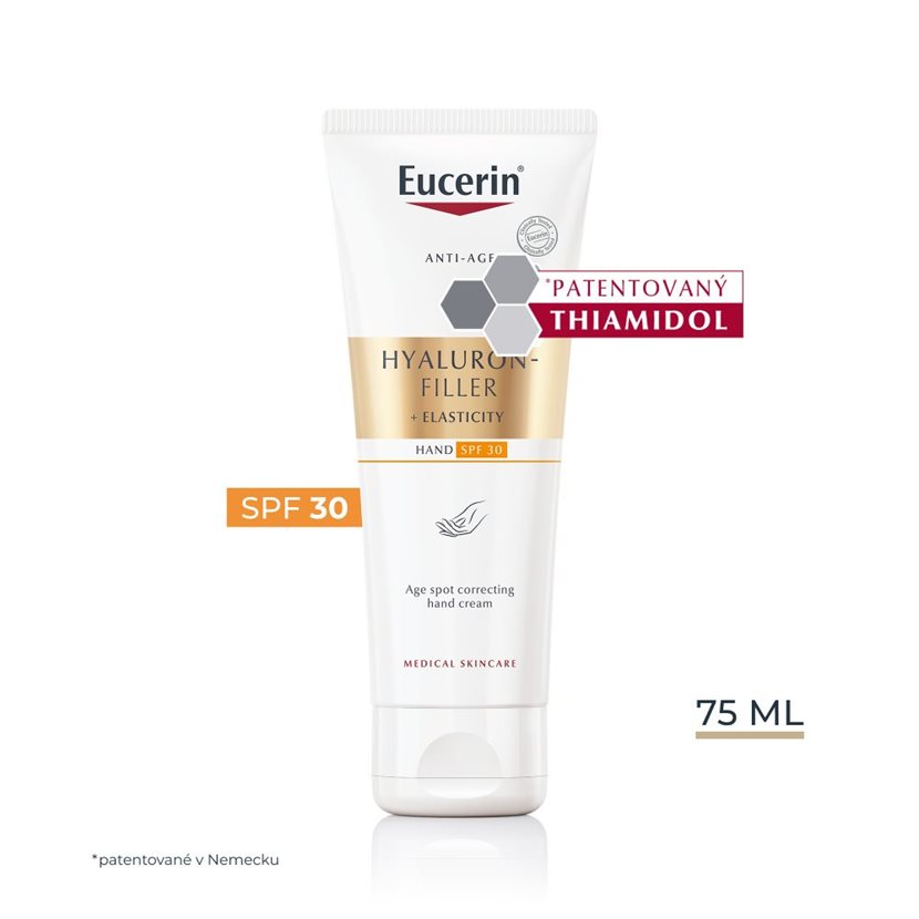 S cílem zmírnit výskyt pigmentových skvrn a zabránit jejich opětovnému výskytu jsme vytvořili Eucerin Hyaluron-Filler + Elasticity Krém na ruce s depigmentačním účinkem. Tento krém na ruce se dobře vstřebává, zanechává pokožku viditelně pevnější a je také neuvěřitelně účinný při hydrataci pokožky, kterou zanechává příjemně vyživenou po celý den. Eucerin Hyaluron-Filler + Elasticity Krém na ruce s depigmentačním účinkem byl vytvořen s unikátním složením, které přináší řadu omlazujících účinků. Obsahuje náš kolagen-elastin komplex, který urychluje obnovu kolagenu v kožních buňkách. Obsahuje také thiamidol, účinnou a patentovanou složku, která působí na základní příčinu hyperpigmentace tím, že snižuje produkci melaninu. Inovativní směs vysokomolekulární a nízkomolekulární kyseliny hyaluronové viditelně vyplňuje hluboké vrásky.