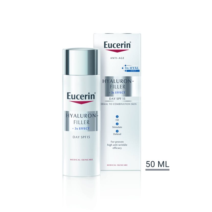 Eucerin Hyaluron-Filler Denní krém SPF 15 bojuje s prvními známkami stárnutí smíšené pleti. Viditelně vyhlazuje jemné linky i hluboké vrásky, a stará se tak o mladistvý vzhled pleti. Poskytuje pleti účinnou ochranu proti předčasnému stárnutí způsobenému UV zářením a proti prohlubování vrásek a zároveň ji chrání před volnými radikály.