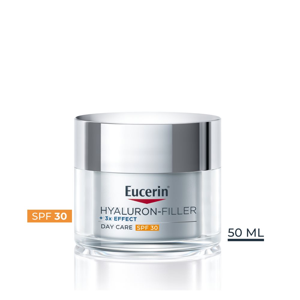 S přibývajícím věkem pleť ztrácí hydrataci a pevnost, což vede k tvorbě jemných linek a hlubších vrásek. Eucerin Hyaluron-Filler + 3x Effect Denní krém SPF 30 obsahuje vysokomolekulární a nízkomolekulární kyselinu hyaluronovou, která poskytuje hydrataci tam, kde je nejvíce potřeba. Zatímco vysokomolekulární kyselina hyaluronová vyhlazuje povrch pleti a zlepšuje zadržování hydratace, nízkomolekulární kyselina hyaluronová proniká hlouběji a viditelně vyplňuje vrásky zevnitř. Obsažený glycin saponin podporuje přirozenou produkci kyseliny hyaluronové v pleti, zatímco enoxolon pomáhá zpomalit její rozpad a zajišťuje tak déle trvající hydrataci. Tento Eucerin Denní krém SPF 30 poskytuje širokospektrální UVA/UVB ochranu, a chrání tak pleť před stárnutím způsobeným slunečním zářením.