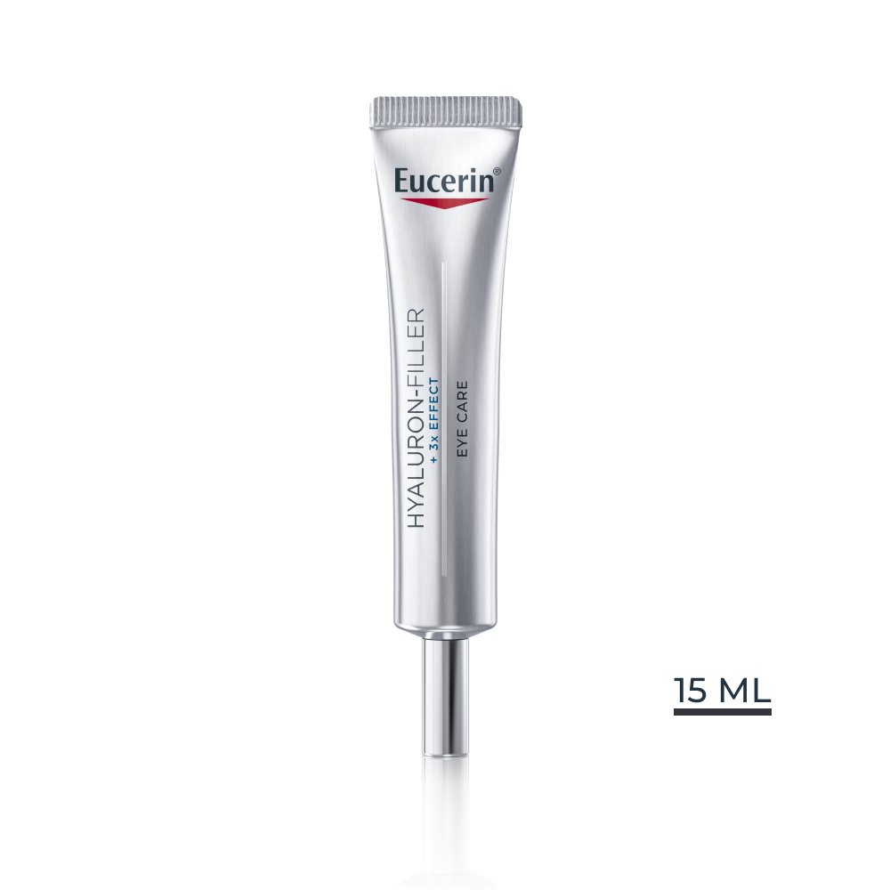 Eucerin Hyaluron-Filler + 3x Effect Oční krém SPF 15 viditelně redukuje jemné linky a vrásky. Jeho složení 3x EFFECT funguje třemi způsoby: vyplňuje vrásky pomocí vysokomolekulární a nízkomolekulární kyseliny hyaluronové, stimuluje vlastní produkci kyseliny hyaluronové pomocí glycin saponinu a pomáhá chránit před předčasným stárnutím. Složení bez parfemace se rychle vstřebává a je oftalmologicky testováno, takže je ideální pro každodenní použití, a to i pod make-up.