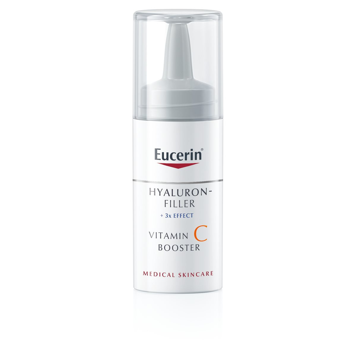 Eucerin Hyaluron-Filler Vitamin C Booster využívá antioxidační a prokolagenní účinky 10% čistého a čerstvě aktivovaného vitamínu C. Obsahuje také nízkomolekulární kyselinu hyaluronovou a je klinicky a dermatologicky prokázáno, že pleť povzbuzuje, vyplňuje vrásky a zanechává pleť na pohled hladší, svěžejší a zářivější za pouhých sedm dní a výsledky se postupem času dále zlepšují. Lze jej použít jako samostatné sérum s účinky proti prvním známkám stárnutí, nicméně doporučujeme jej používat v kombinaci s denními krémy z řady Eucerin Hyaluron-Filler + 3x EFFECT, jako jsou: Eucerin Hyaluron-Filler + 3x EFFECT Denní krém SPF 15 a Eucerin Hyaluron-Filler + 3x EFFECT Denní krém SPF 30.