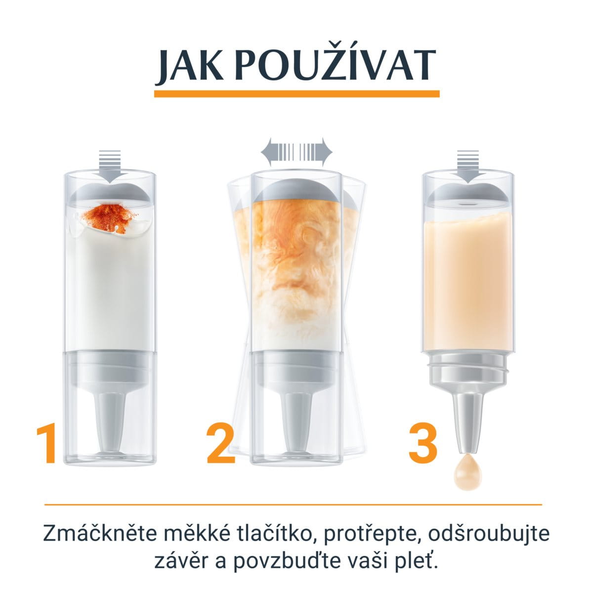 Vitamín C je silný antioxidant, který neutralizuje volné radikály a posiluje vlastní obranný systém pleti. Je také nezbytný pro tvorbu kolagenu v kožních buňkách, který pomáhá podporovat strukturu pleti a oddálit známky stárnutí. Inovativní balení umožňuje čerstvě aktivovat vitamín C při prvním použití. Stačí stlačit a protřepat vitamín C v prášku s emulzí s nízkomolekulární kyselinou hyaluronovou a licochalconem A. Výrobek je nejúčinnější po dobu 21 dnů.