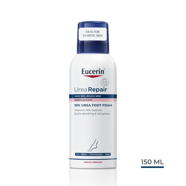 Eucerin UreaRepair Krém na nohy 10% Urea a Eucerin UreaRepair Pěna na nohy 10% Urea obsahují stejné klíčové účinné složky, ale Eucerin UreaRepair Pěna na nohy 10% Urea se v některých důležitých aspektech liší. Má příjemnou parfemaci zklidňující pokožku, pěnovou konzistenci a je k dostání ve formě spreje, přináší tedy odlišné uživatelské vlastnosti od krému. Také se rychle vstřebává, je nelepivá a nemastná.
