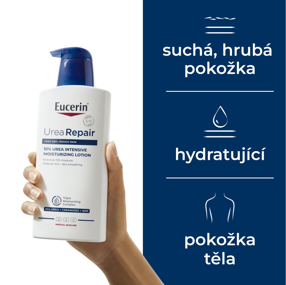 Intenzivní UreaRepair Tělové mléko 10% Urea od značky Eucerin obsahuje vysokou koncentraci urey, dalších přirozených hydratačních látek (které vážou vodu v pokožce) a ceramidů (obnovují kožní bariéru a snižují ztrátu hydratace). Výrobek poskytuje okamžité zklidnění a působí i nadále tím, že oddaluje známky velmi suché a hrubé pokožky až o 72 hodin.
